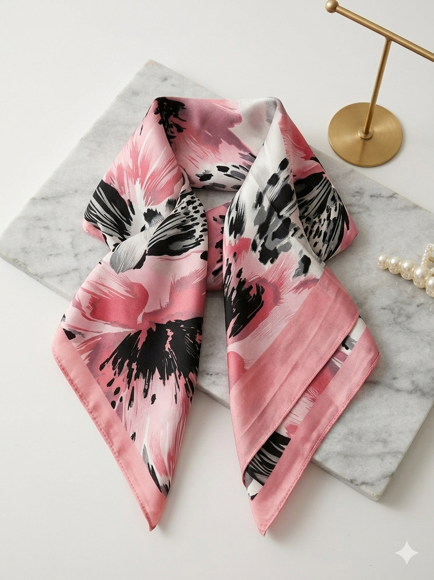 Μαντηλι Satin-Feel με Floral Abstract σχεδιο- Pink & Grey